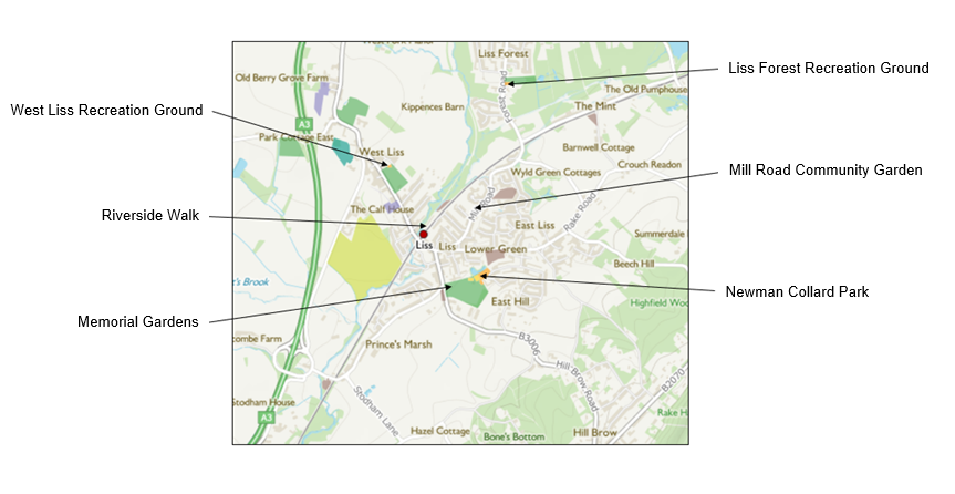 Liss Parish Council maintains three recreation grounds, the first section of the Riverside Walk which includes a picnic and play area and the Mill Road Community Garden.